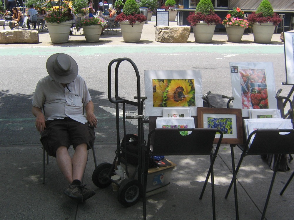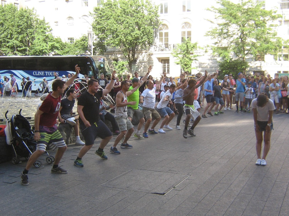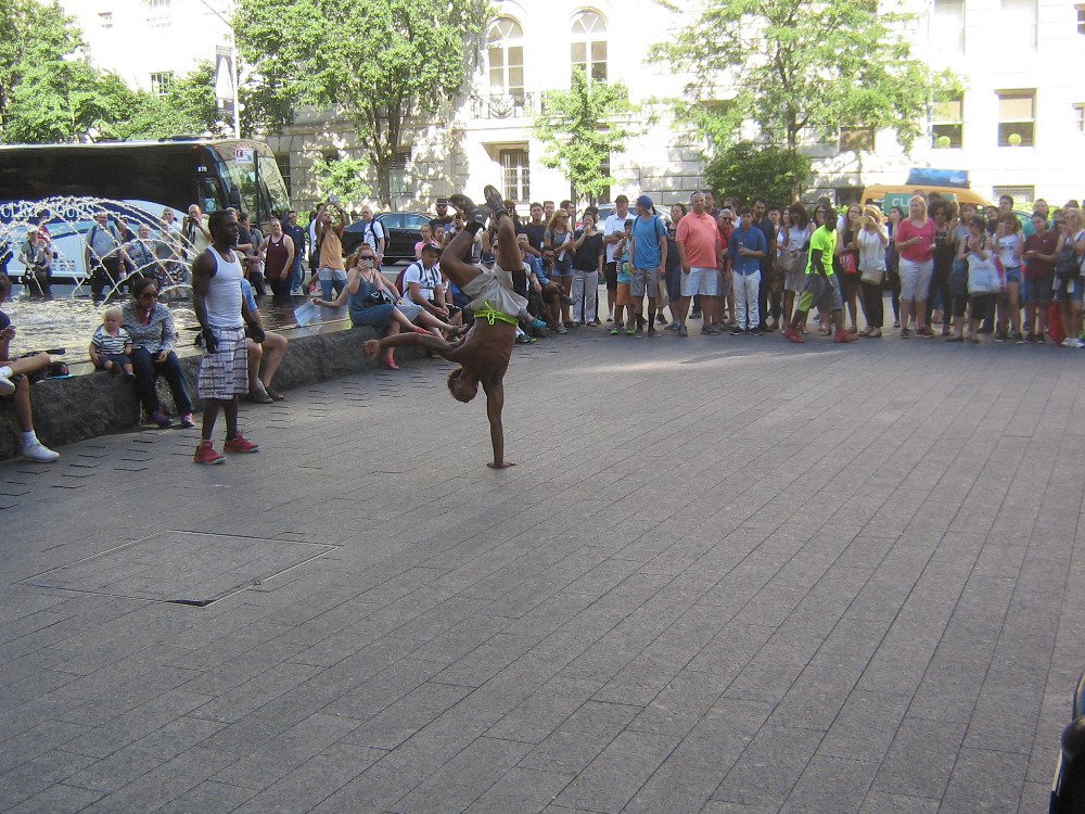 Před muzeem je ale taky veselo. Nějaká parta černých pouličních akrobatů tam v rytmu techna předvádí stojky, salta a jiné prostocviky. (foto níže) Najdeme si místo na schodišti, které momentálně slouží jako tribuna a je zaplněné diváky od chodníku skoro až k muzeu. Afrobati ještě chvíli dovádí, ale potom začnou vybírat z obecenstva dobrovolníky pro další číslo. Ten, koho vyberou, se vždycky představí a řekne, odkud je. A vzorek je to pestrý jako celý New York, vlastně jako celý svět: Korejec, Ital, Američan, Švéd, Brazilec, Australan…a Čech. Naštěstí to nejsem já, ale můj syn, kterého vyberou jako posledního. Postarší týpek na schodišti kousek ode mě se v reakci na to zeptá udiveně postarší ženský, co sedí vedle něho: „Where’s he from?“ Ženská odpoví nejistě: „He’s from the Czech Republic?!“