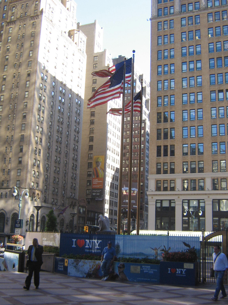 Potom už stačí jen přejít ulici Central Park West, protože hned naproti Dakota House je jeden z hlavních vchodů do Parku, do jeho části nazvané Strawberry Fields (foto níže), kde je na Johnovu památku na chodníku mozaika s nápisem IMAGINE (foto ještě níže). Na lavičkách kolem ní sedí plno lidí, někteří hrají na kytary a zpívají Johnovy písničky. Vyfotíme se postupně všichni čtyři u mozaiky, pak si taky sedneme na lavičku a posloucháme písničky. Je to smutné, ale zároveň tak trochu pohodové, dokud nepřikluše nějaký rozzuřený magor a nezačne vykřikovat něco o zasraných turistech, znesvěcení památky a podobný hovadiny. Jeho výstup vyvrcholí tím, že začne odhazovat z mozaiky všechno, co na ni podle něho nepatří. Do křoví letí nejen skoro všechny květiny, co tam lidi položili, ale i nádoba s americkou vlaječkou. To už je na mě trochu moc, tak se vrhám do křoví taky, abych zachránil aspoň tu vlajku. Nenápadně ji strčím do příruční tašky, je sice trochu špinavá, ale to mi nevadí: nejlepší suvenýr z Ameriky.