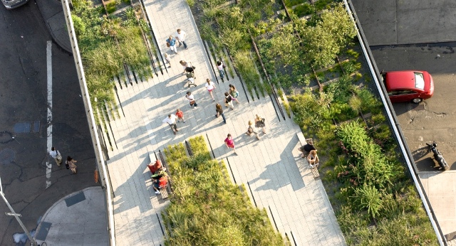 High Line park je uměle vytvořený park na původní nadzemní železniční dráze.