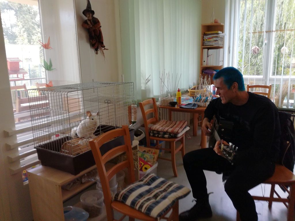 Což mi připomíná, že druhý koncert vyšel lépe, dorazilo jedna třicet lidí, obě strany byly naprosto nadšené. Vybavuji si, že pár hodin před tím, Corey tiše brnkal činčile (foto níže) v denním centru pro osoby s mentálním postižením, kde dělám dobrovolníka. Stála na svém domečku ve své kleci a upřeně bez hnutí na něj koukala a vypadala naprosto spokojeně. Ano, zahrál i našim klientům, den předem, přímo v centru. „Bylo úžasné hrát v denním centru, protože jejich reakce byly tak čisté a necenzurované. To opravdu ukazuje sílu hudby.“ řekl v jednom kratičkém rozhovoru o první návštěvě pro český fanblog. Minulý rok se do centra rád vrátil, udržují vzájemný kontakt a všichni se těší na třetí návštěvu.