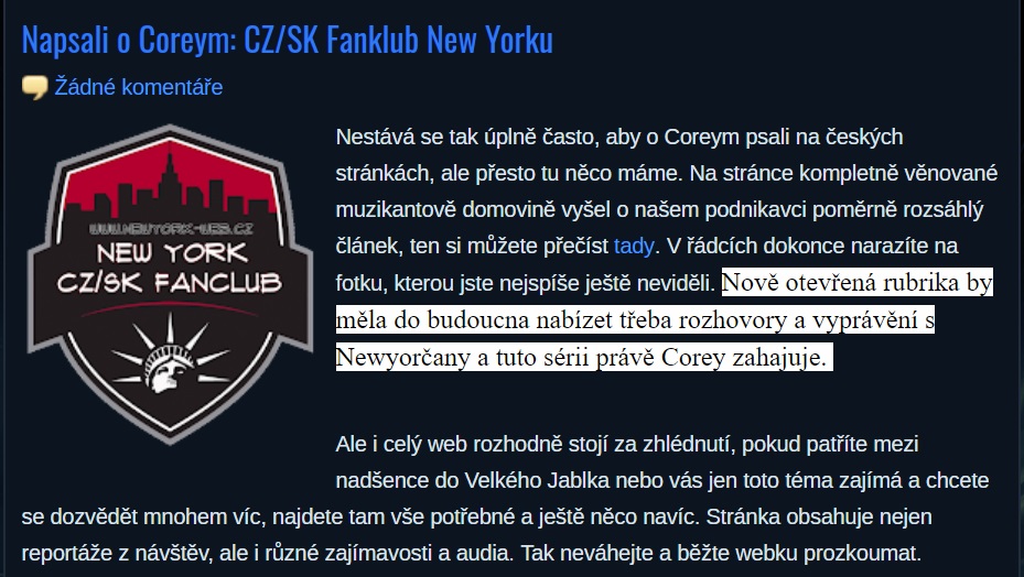 Přátelé, o tomto muži by se dalo napsat mnohem více řádků, možná by se tento článek či co je to, dal brát jako jakýsi úvod do tématu. Na příště se mohu pokusit o nějaký rozhovor, když budete chtít, což by bylo asi záživnější a lepší, nepohrdnu otázkami a nápady na co byste se Coreyho chtěli zeptat vy. Všechny svá alba hudebník poskytuje k poslechu zdarma na své webové stránce.