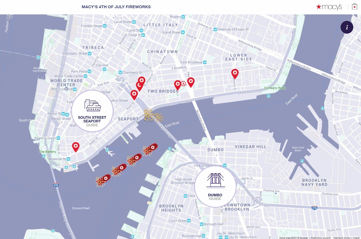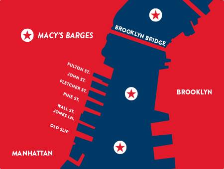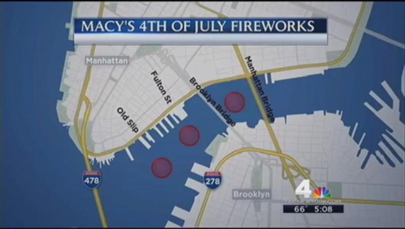Ohňostroje budou vidět po celém New Yorku i okolo sochy Svobody ale ten hlavní MACY'S bude nad řekou East River mezi Manhattanem a Brooklynem. Nad Newyorskými mosty Brooklyn Bridge a Manhattan Bridge.