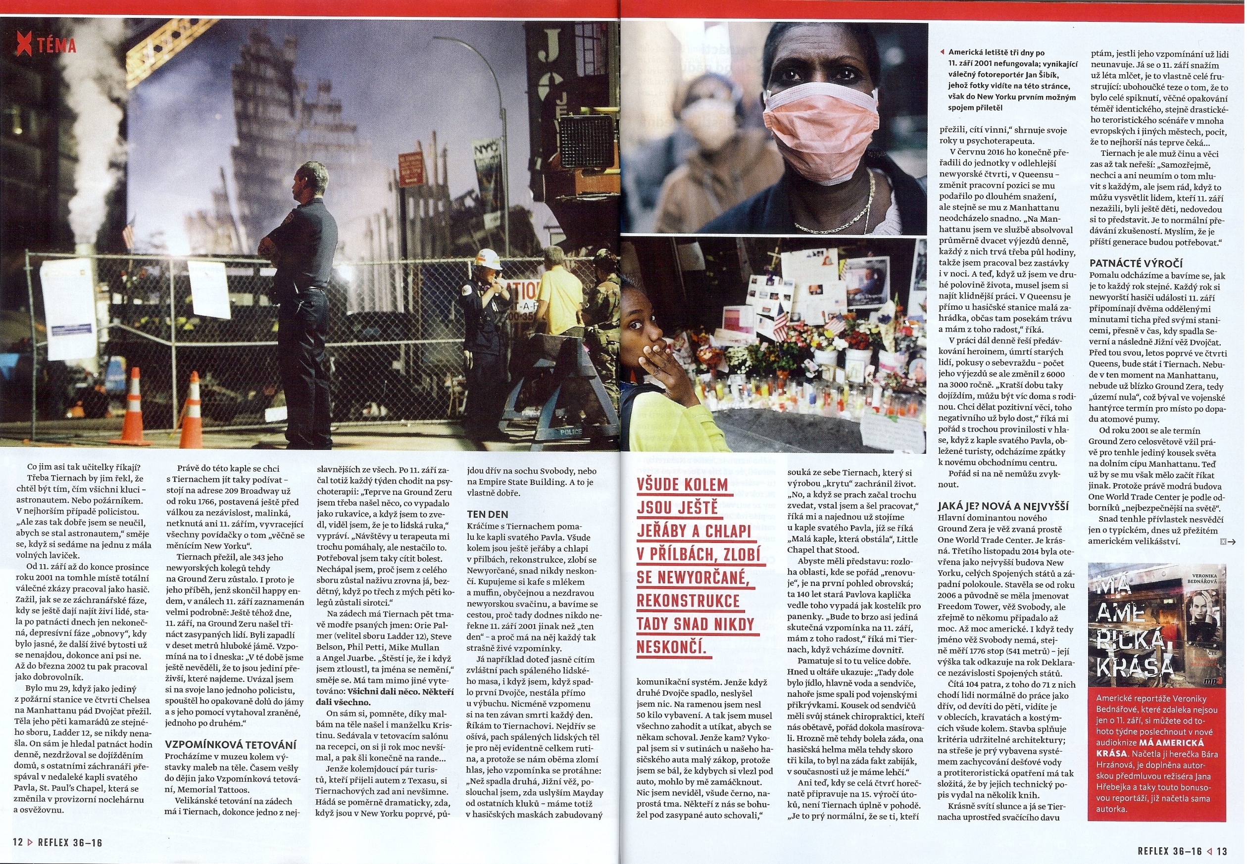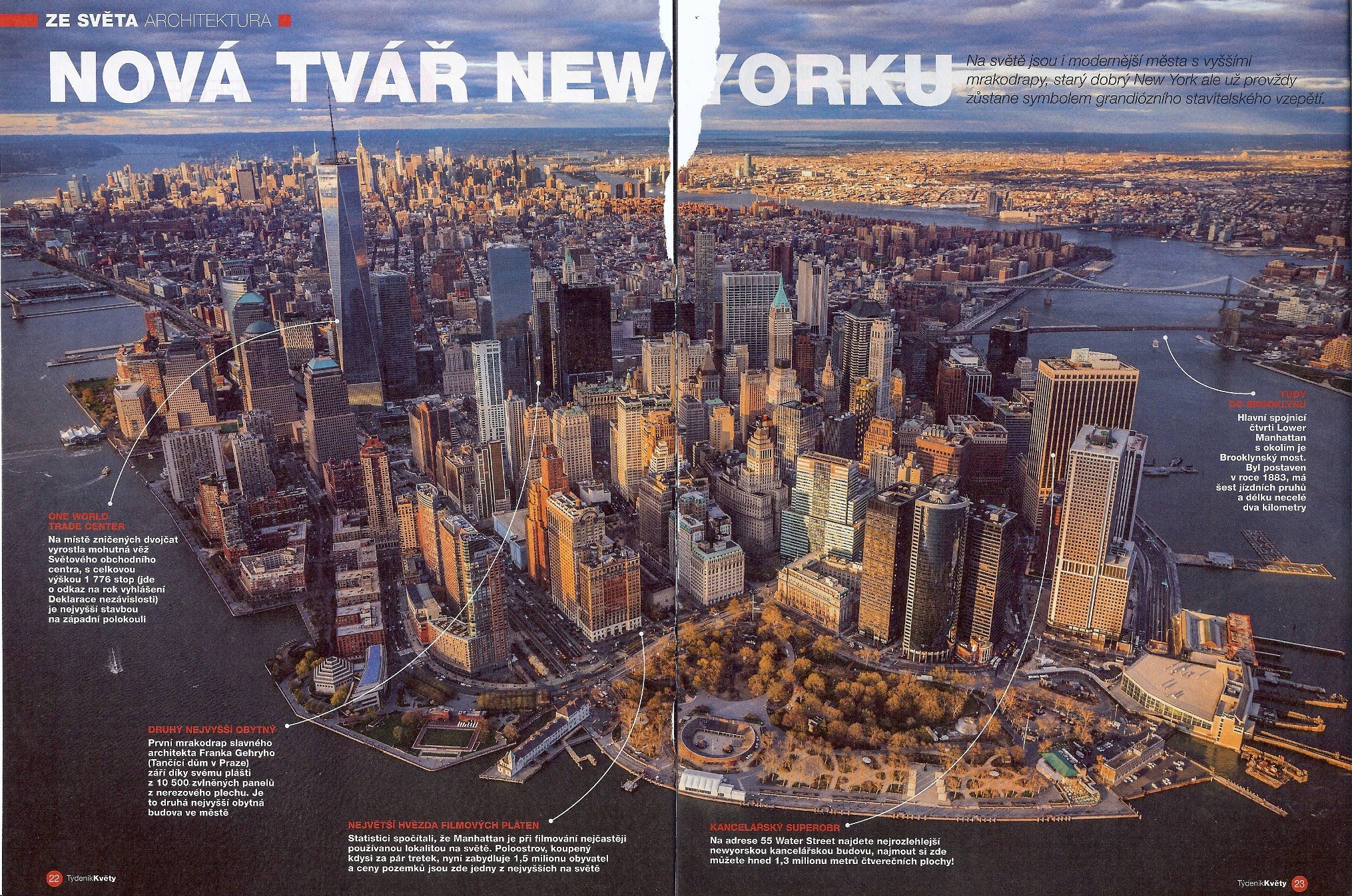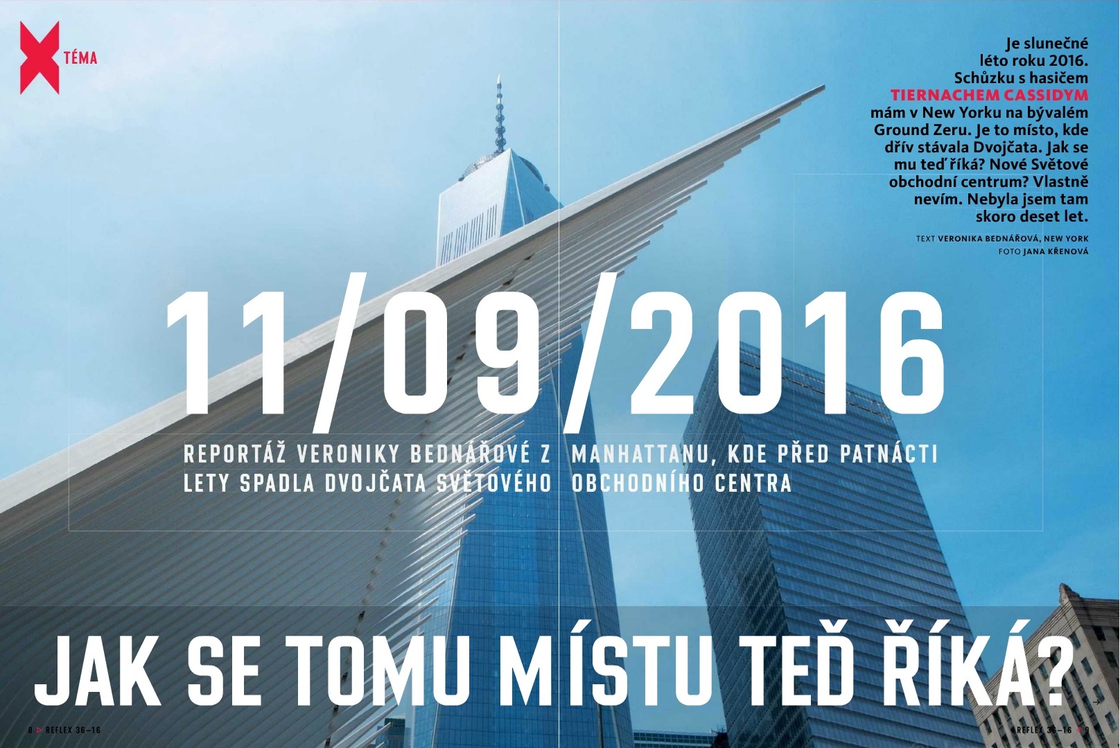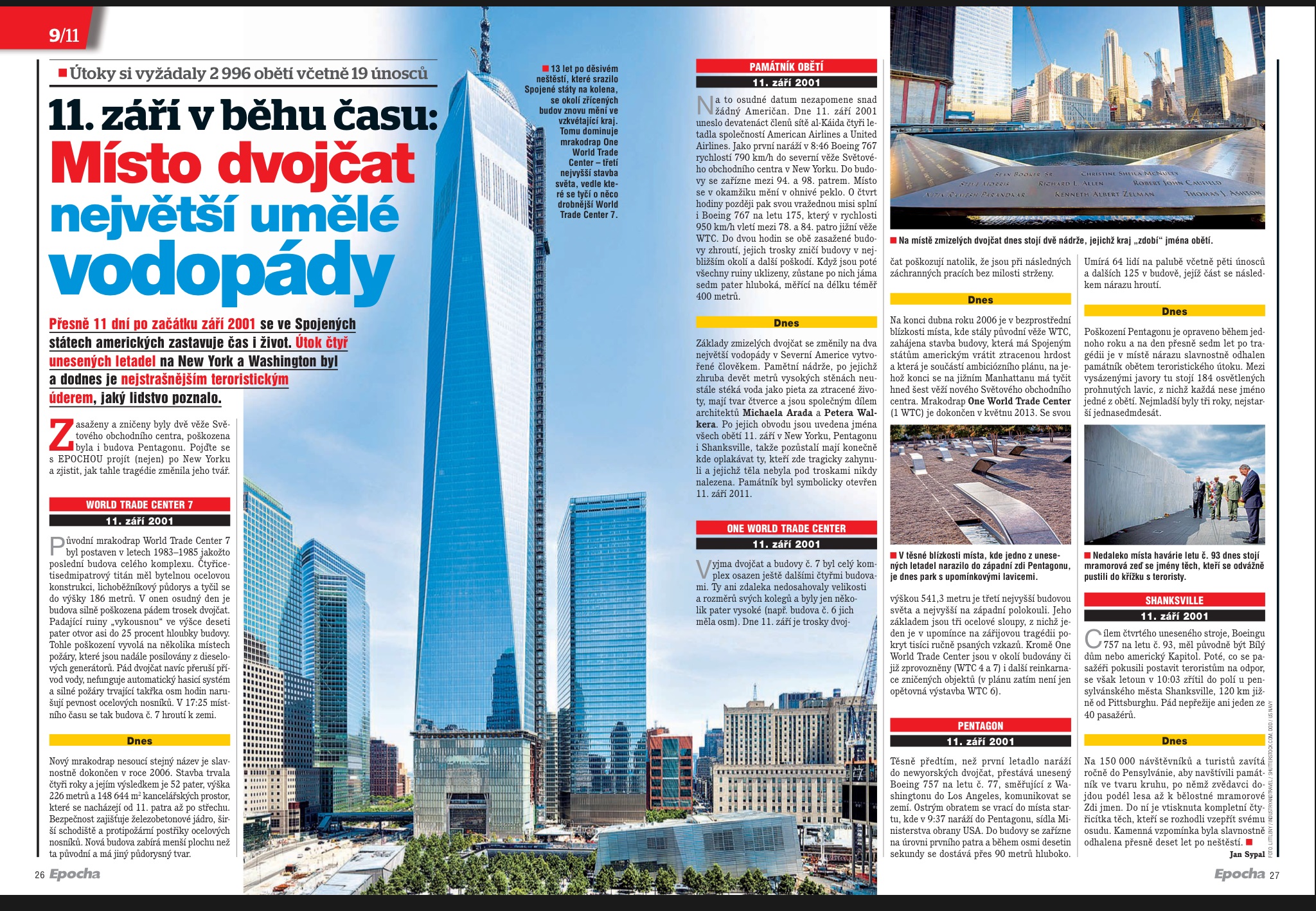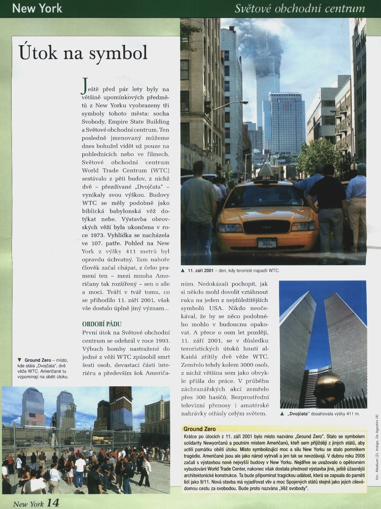 | dvoustránkový článek k 15.výročí teroristických útoků | dvoustránkový článek o místě, kde stála Dvojčata WTC |