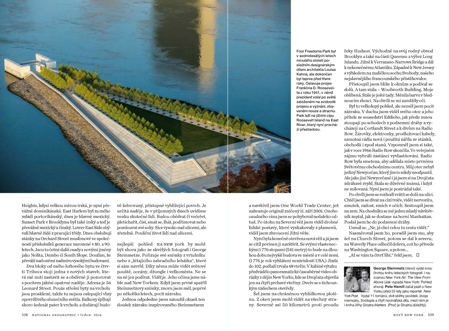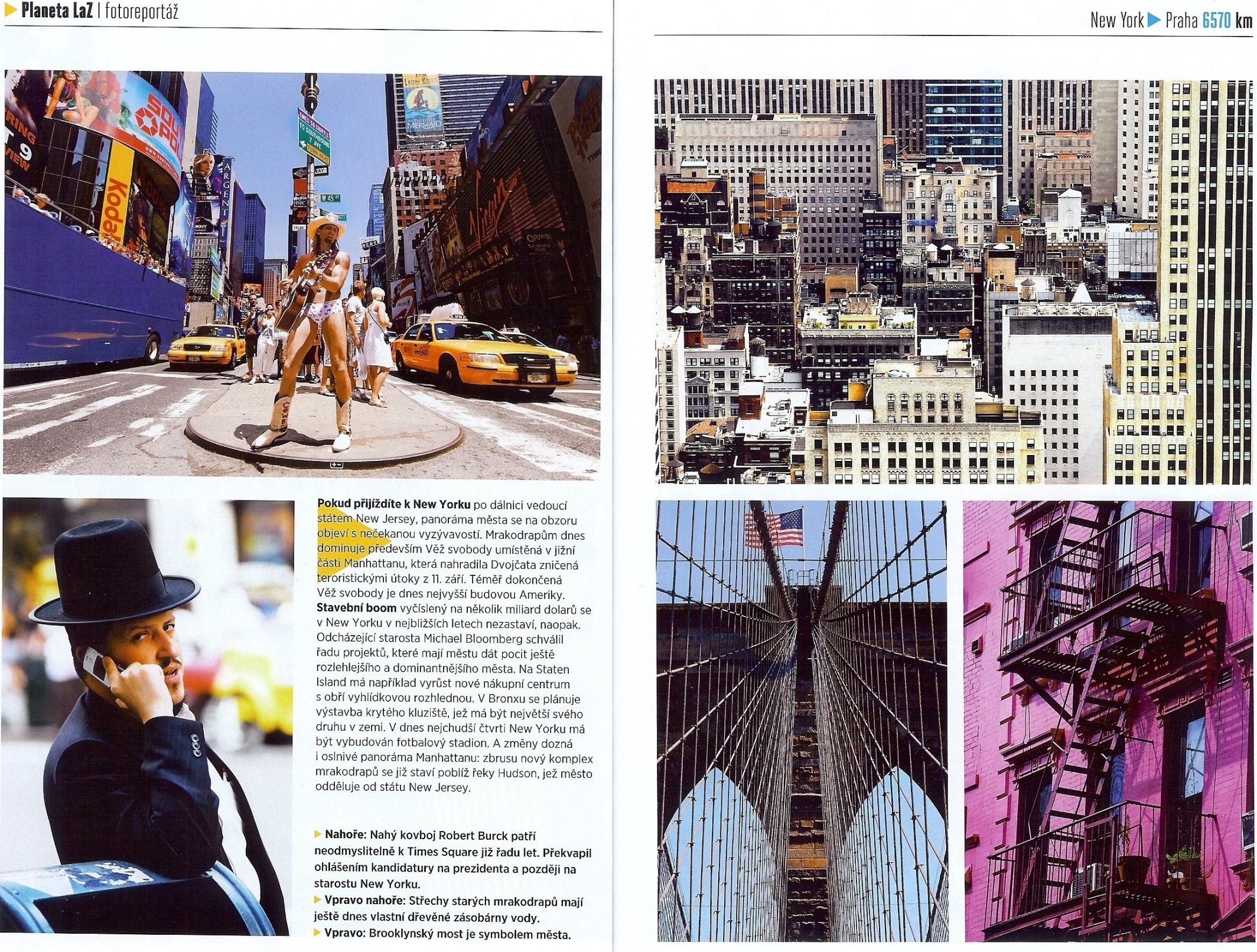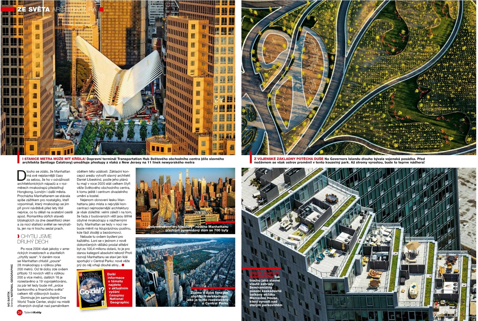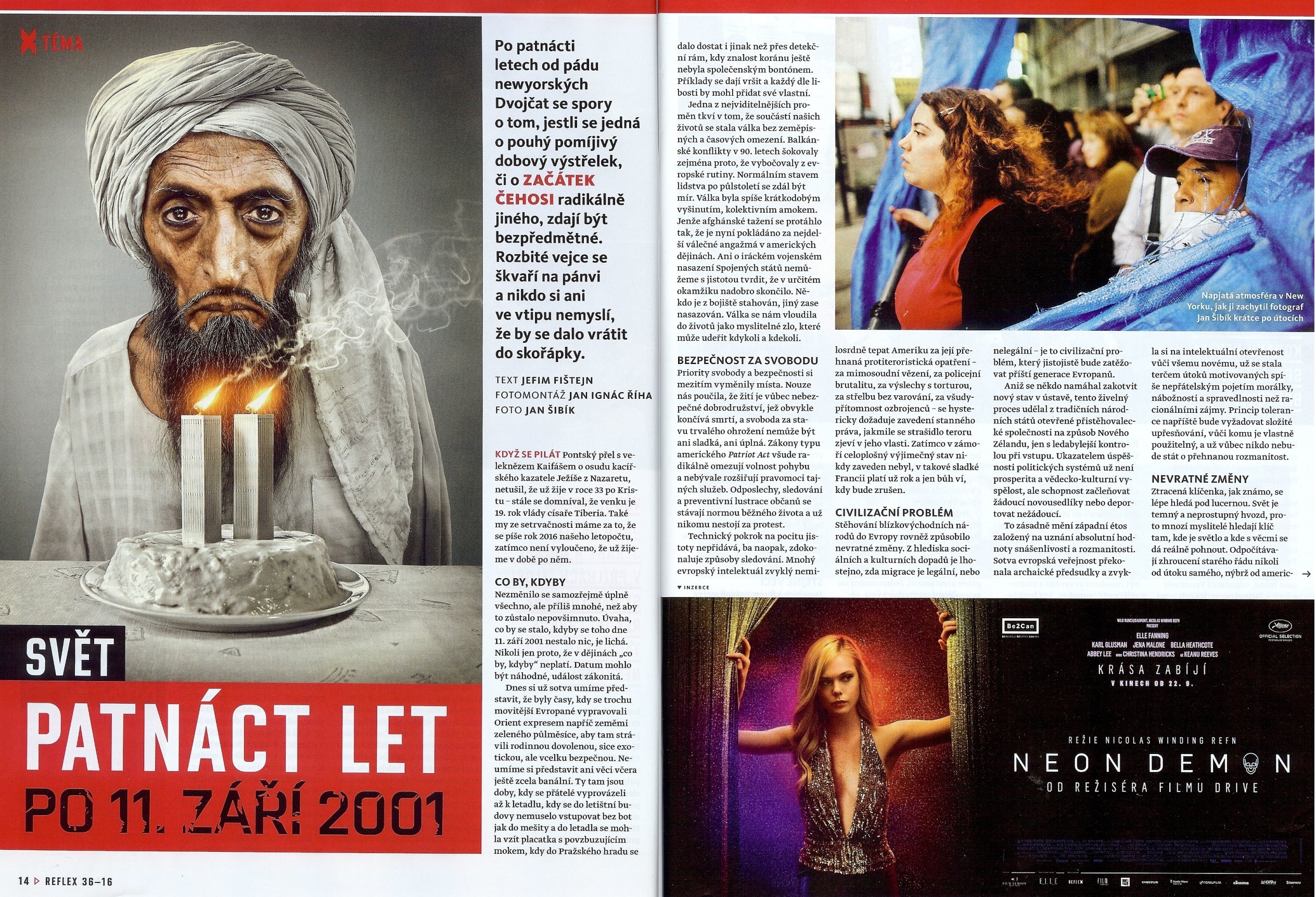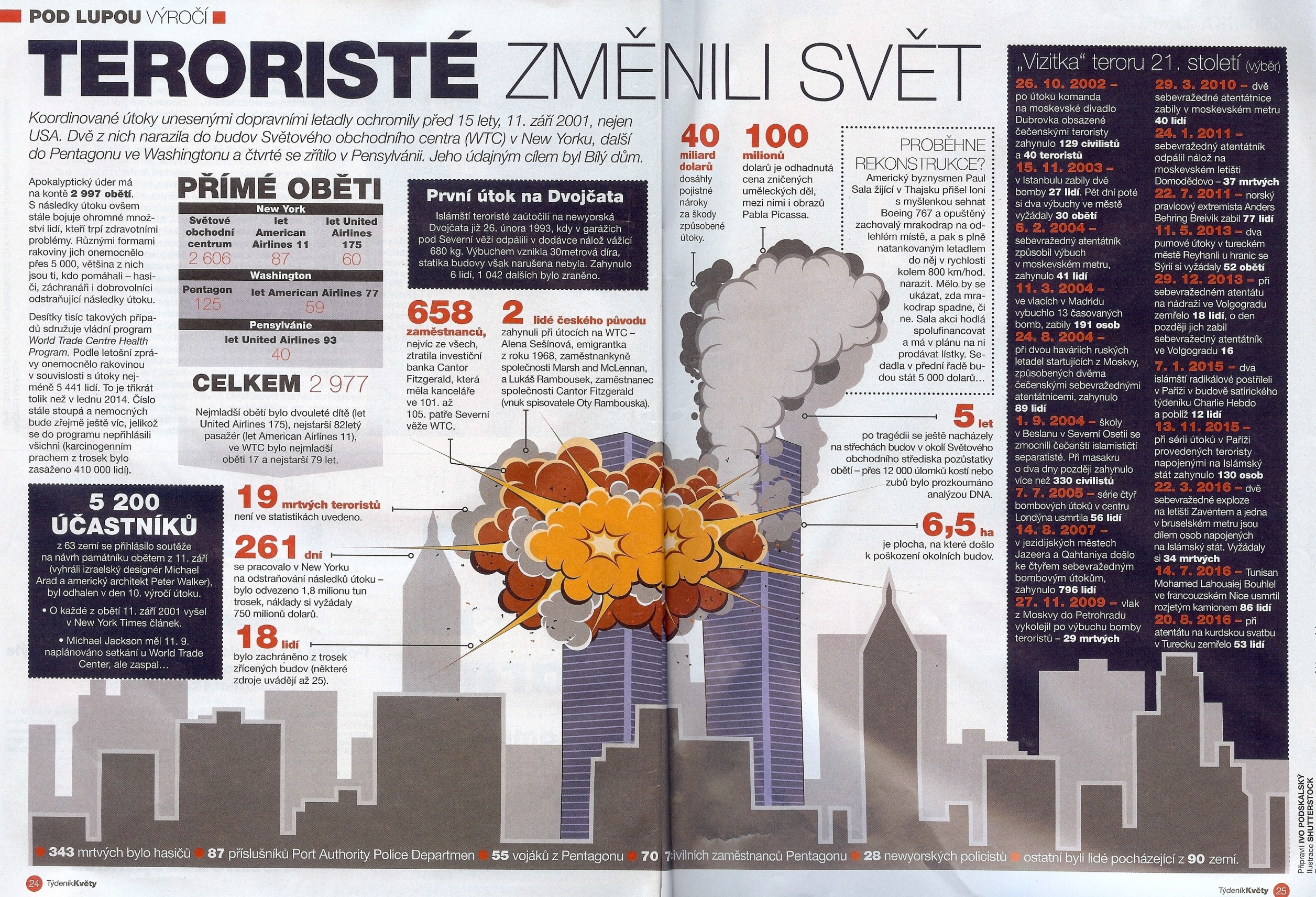 | dvoustránkový článek k 15.výročí teroristických útoků | dvoustránkový článek o místě, kde stála Dvojčata WTC |