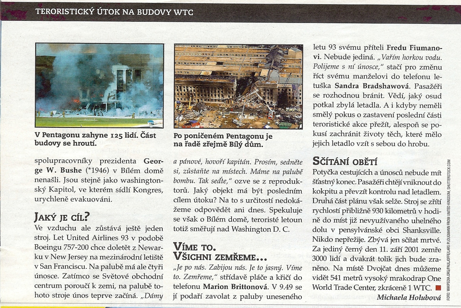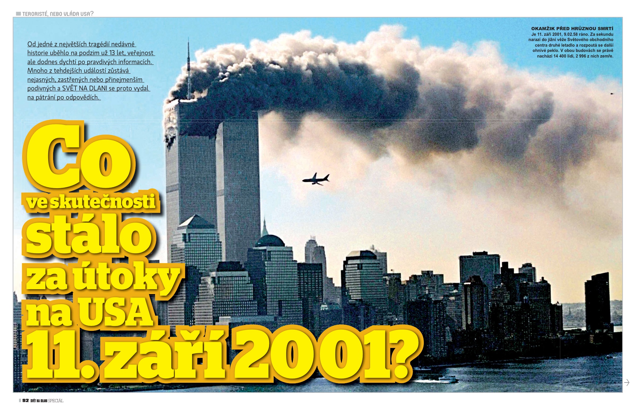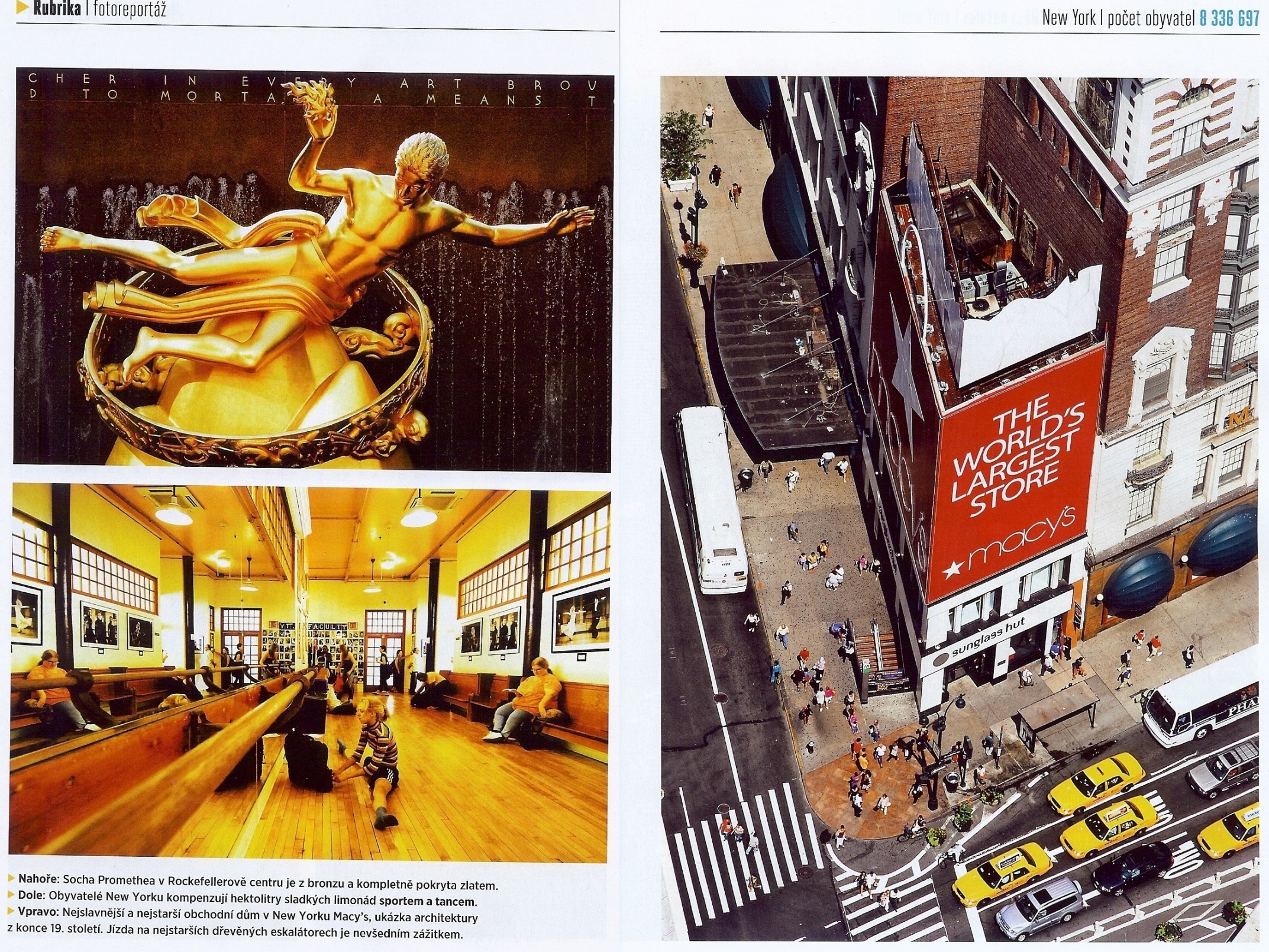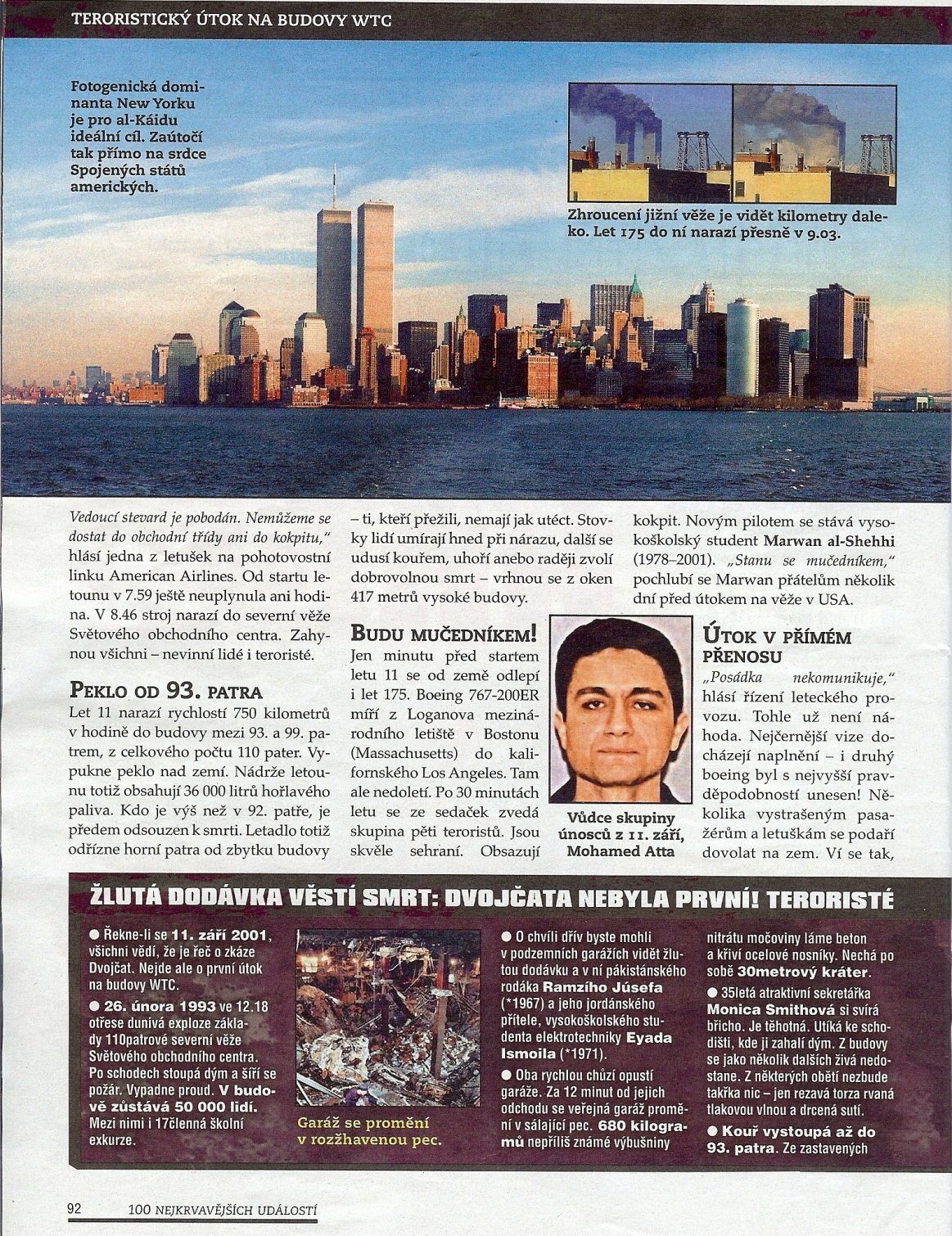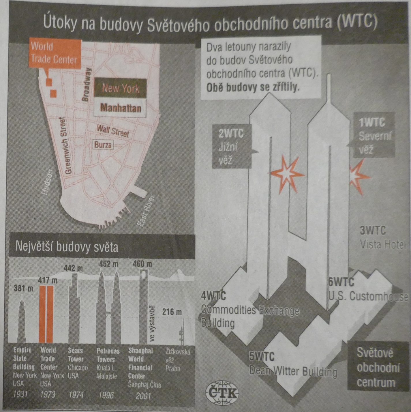 | dvoustránkový článek k 15.výročí teroristických útoků | dvoustránkový článek o místě, kde stála Dvojčata WTC |