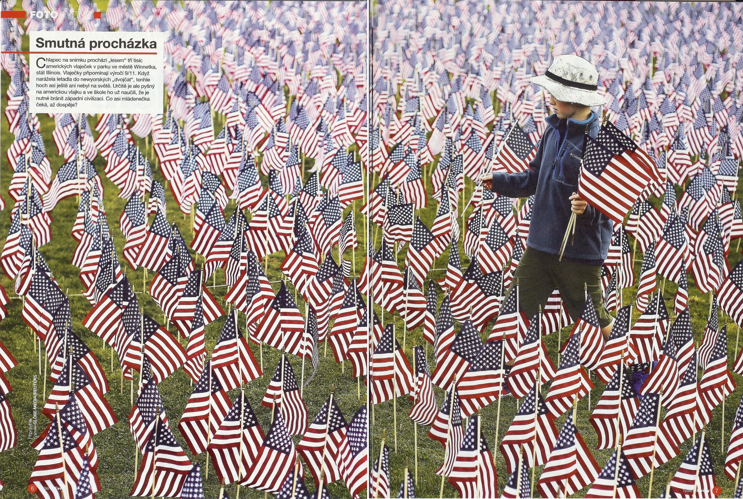 Chlapec na snímku prochází "lesem" tří tisíc amerických vlaječek v parku ve městě Winnetka, stát Illinois. Vlaječky připomínají výročí 9/11. Když narážela letadla do newyorských "dvojčat", tenhle hoch asi ještě ani nebyl na světě. Určitě je ale pyšný na americkou vlajku a ve škole ho už naučili, že je nutné bránit západní civilizaci. Co asi mládenečka čeká, až dospěje ?