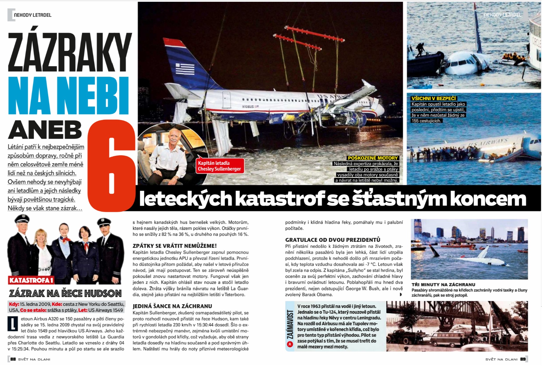 | dvoustránkový článek "Jablko, které se nepřejí" | část z článku "Zázraky na nebi, aneb 6 leteckých katastrof se šťastným koncem" |