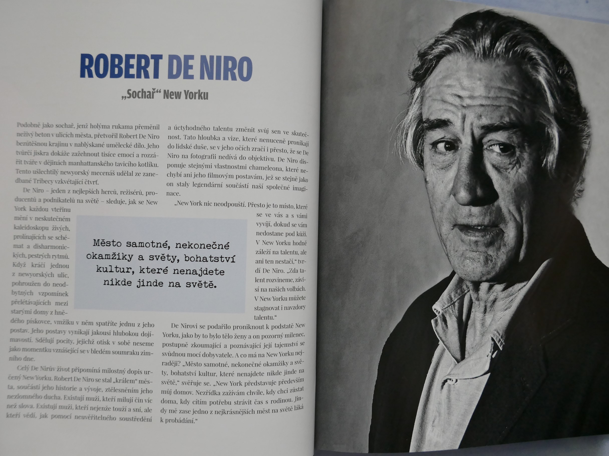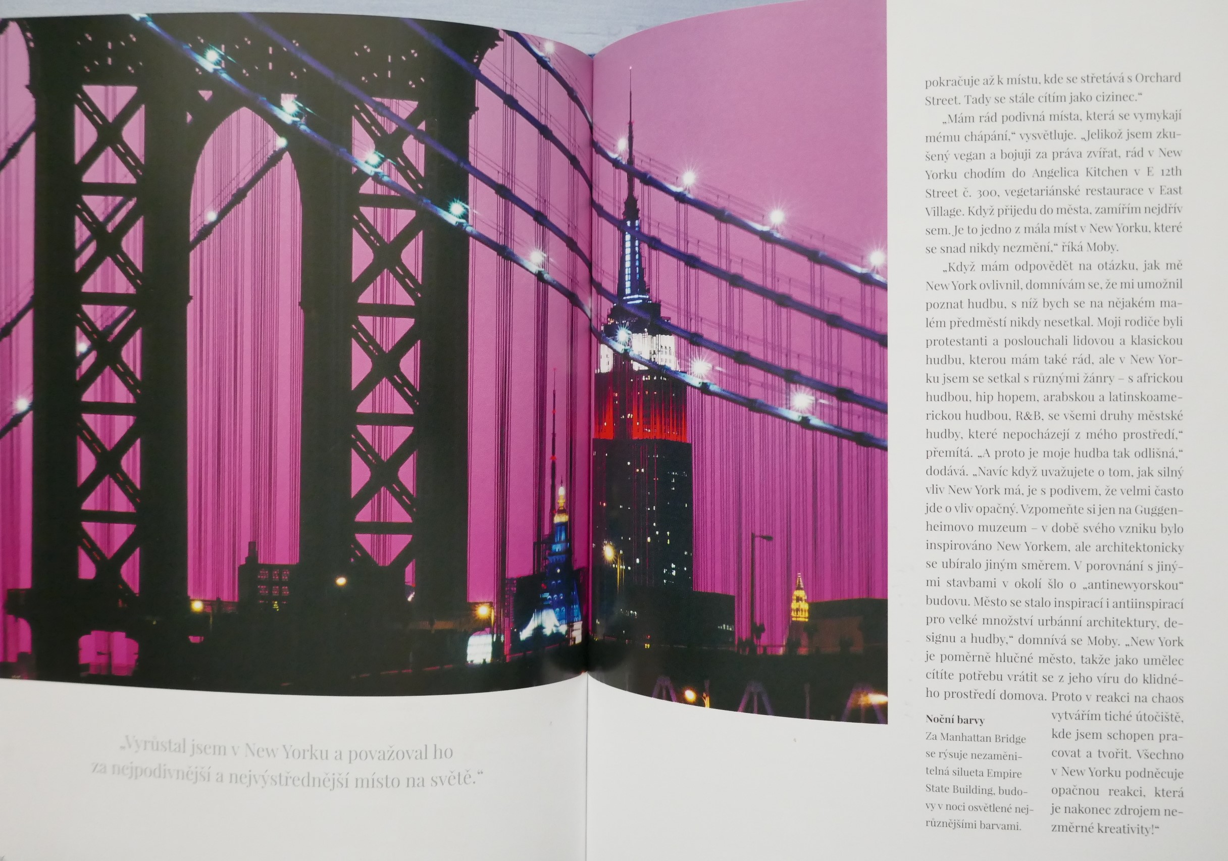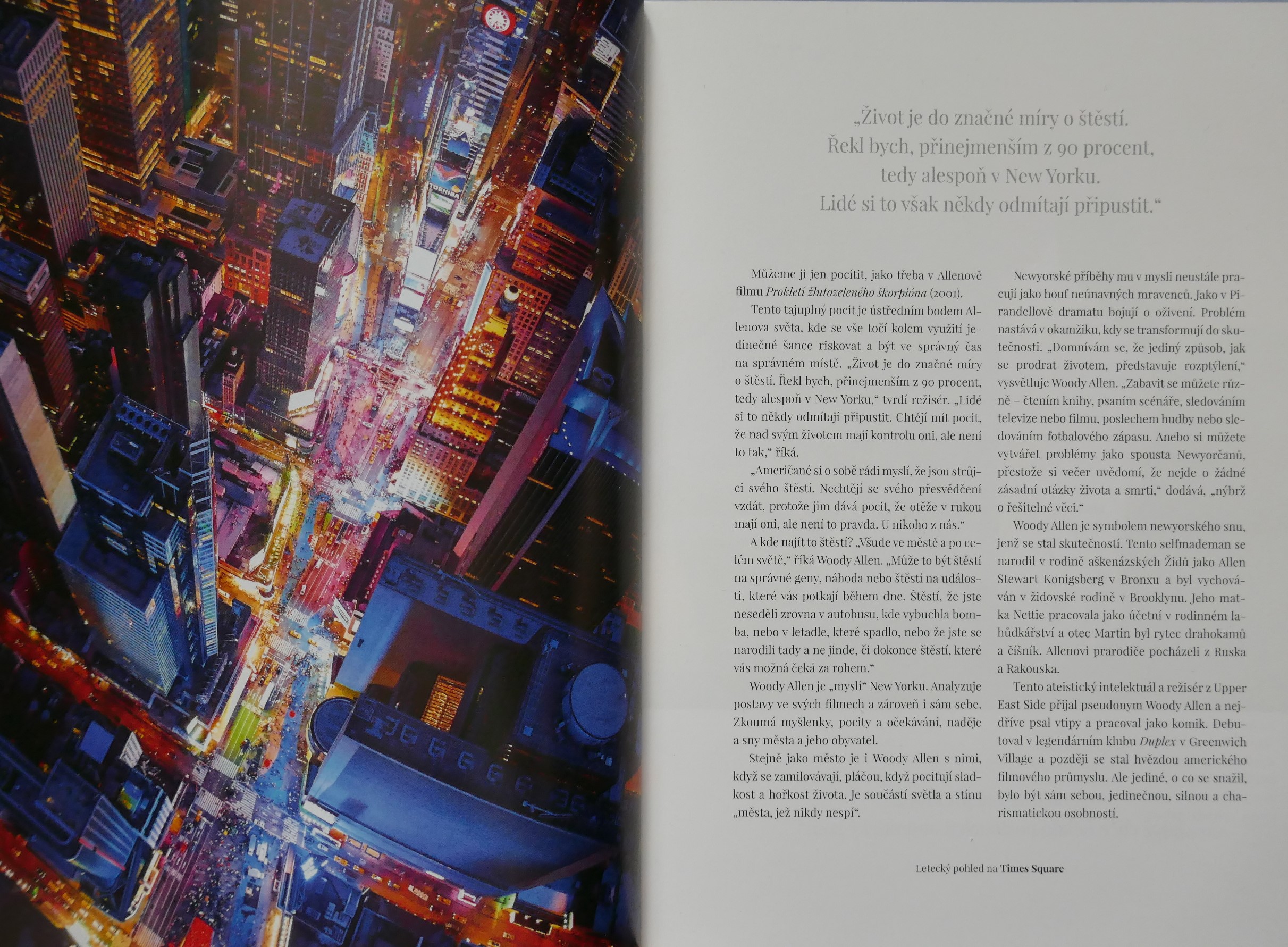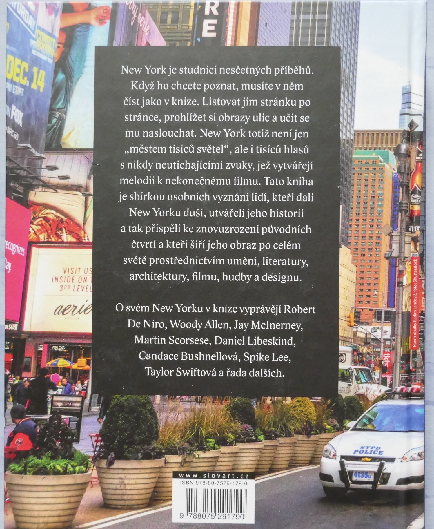 POPIS: Město očima známých osobností. | New York je studnicí nesčetných příběhů. Kdo ho chce poznat, musí v něm číst jako v knize. Listovat jím stránku po stránce, prohlížet si obrazy ulic a učit se mu naslouchat. New York totiž není jen "městem tisíců světel", ale i tisíců hlasů. A když se tyto detaily, každodenní okamžiky pečlivě a trpělivě poskládají jako puzzle, vznikne obraz New Yorku. Pak jako mávnutím kouzelného proutku dostane New York svoji podobu. Tato kniha je vyprávěním osobností, jež daly městu duši, spoluutvářely jeho historii a které šíří jeho obraz po celém světě v oblasti umění, literatury, architektury, kinematografie, hudby a kulinářství - Roberta De Niro i Woodyho Allena, Jaye McInerneyho, Martina Scorseseho i Daniela Libeskinda, Maria Bataliho i Candace Bushnellové, Spikea Leeho a dalších.