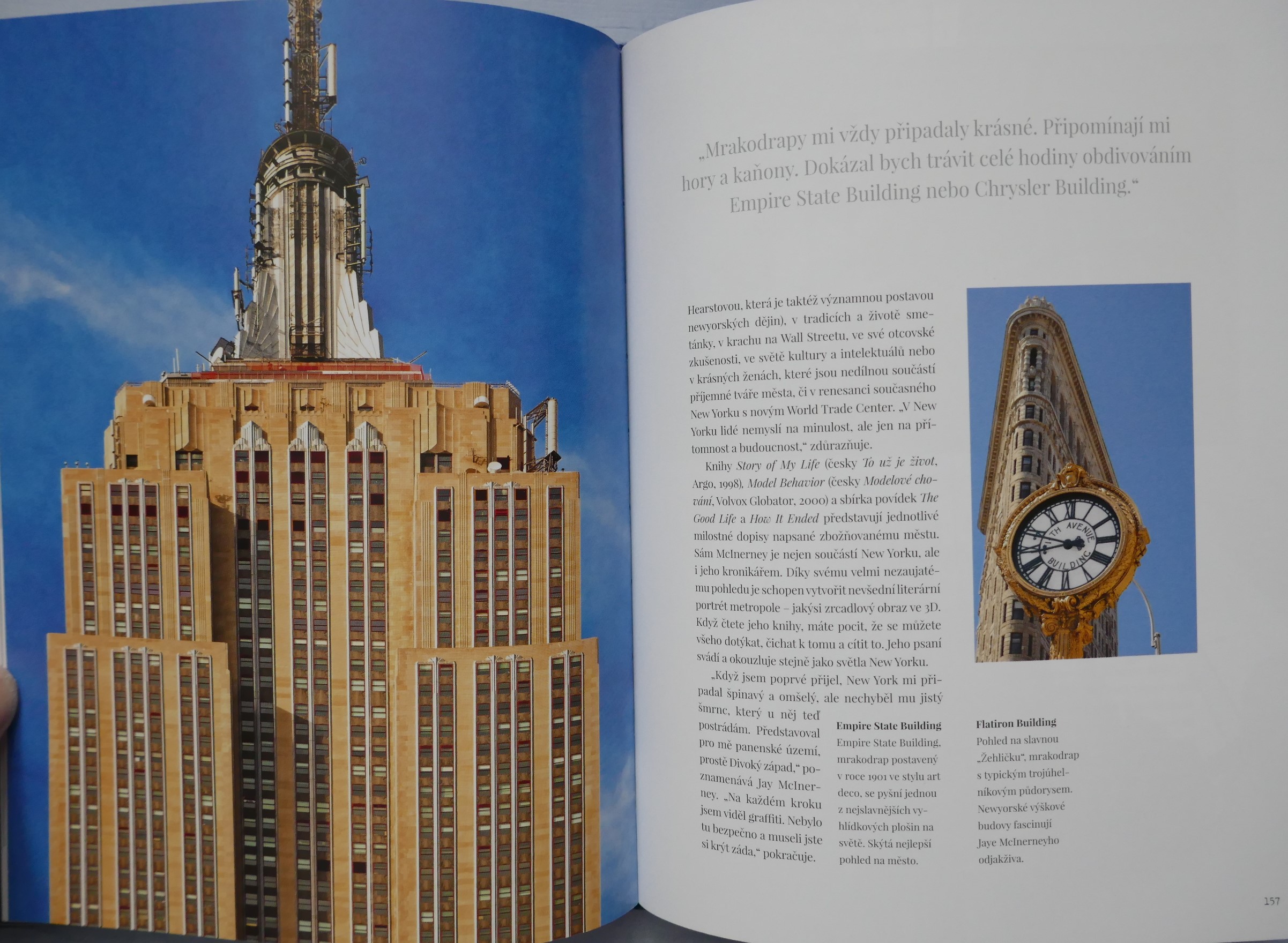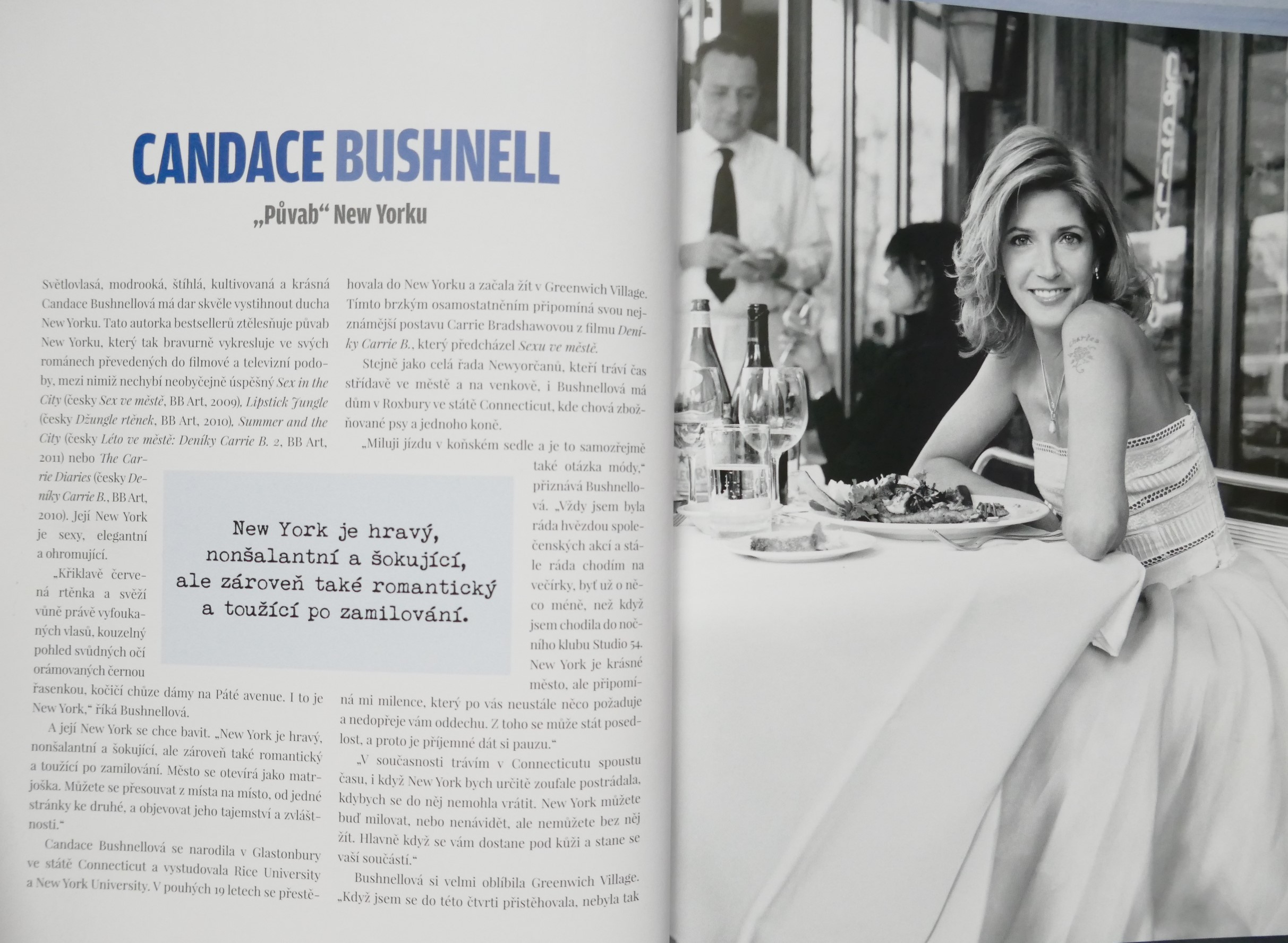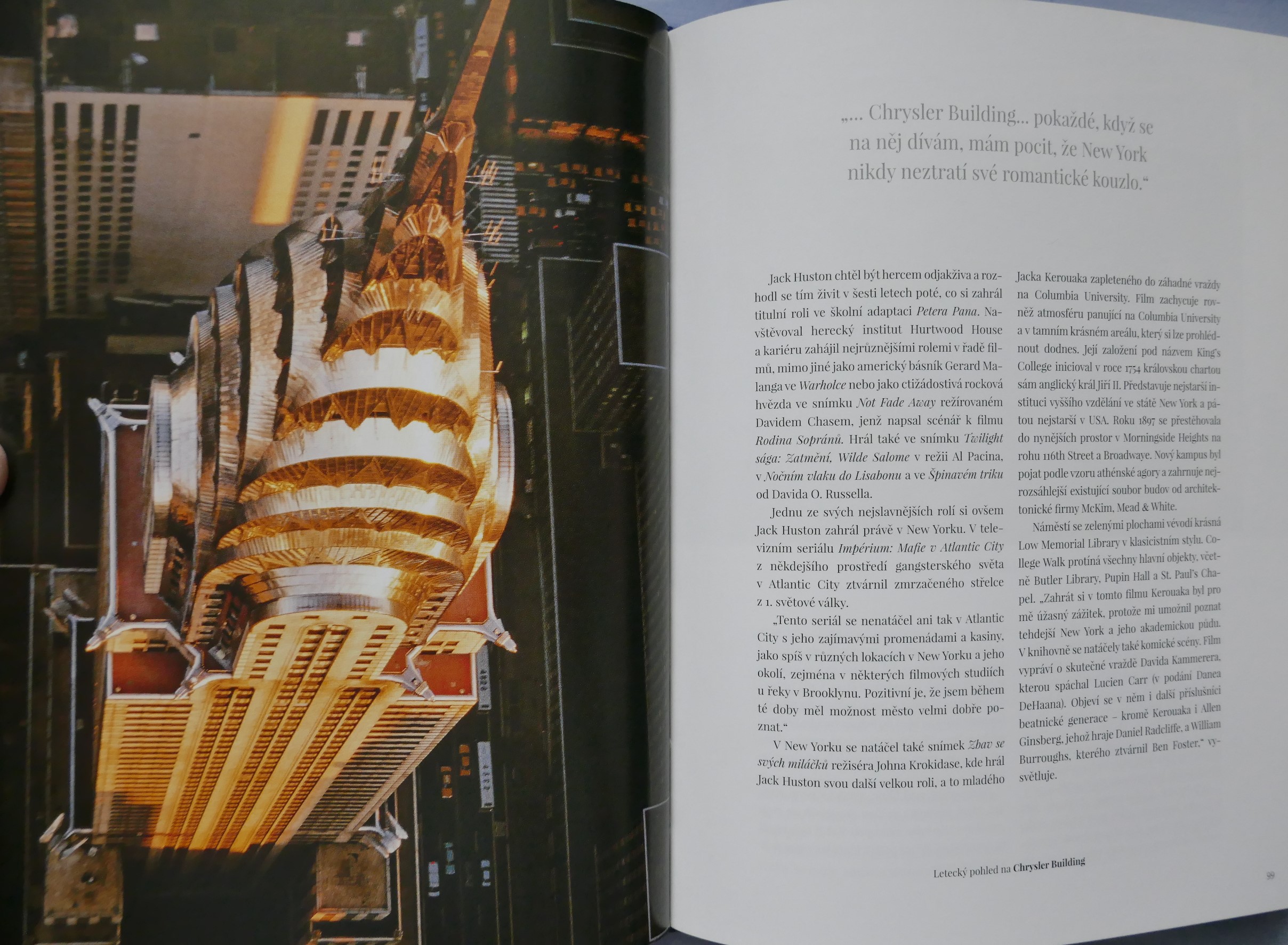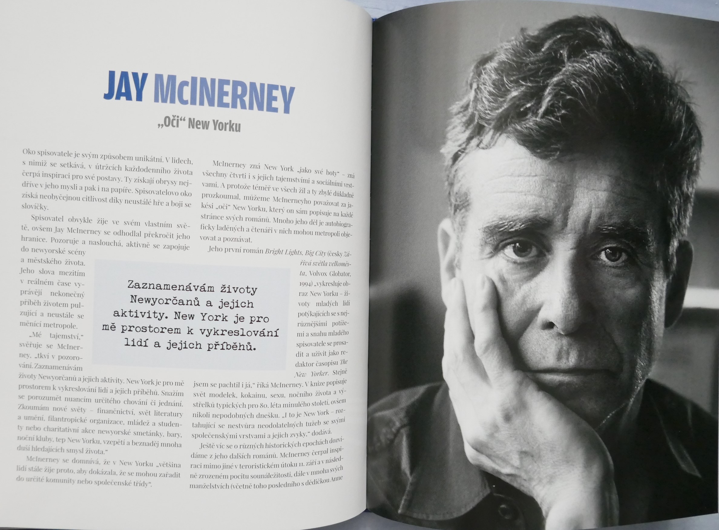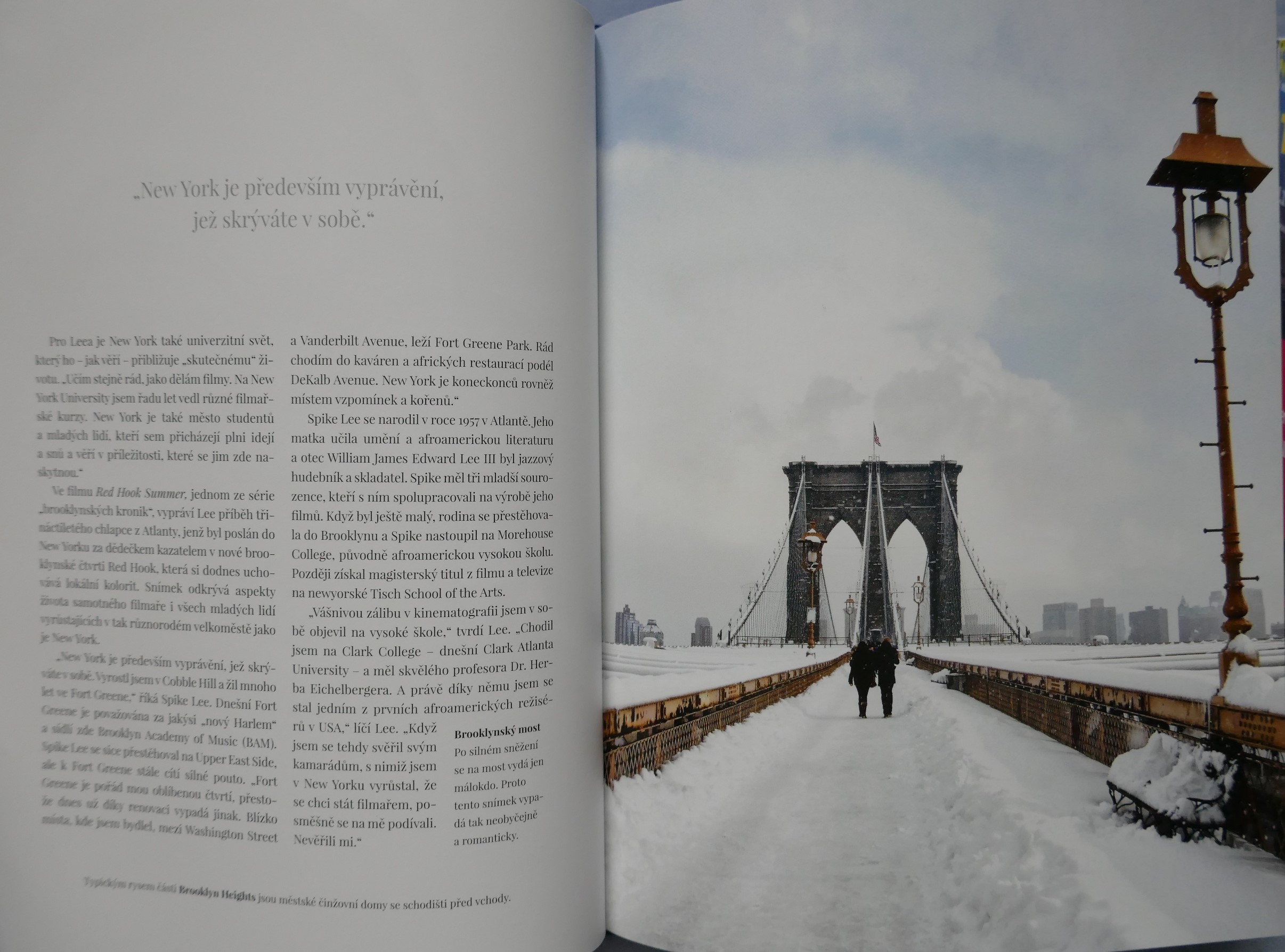 POPIS: Město očima známých osobností. | New York je studnicí nesčetných příběhů. Kdo ho chce poznat, musí v něm číst jako v knize. Listovat jím stránku po stránce, prohlížet si obrazy ulic a učit se mu naslouchat. New York totiž není jen "městem tisíců světel", ale i tisíců hlasů. A když se tyto detaily, každodenní okamžiky pečlivě a trpělivě poskládají jako puzzle, vznikne obraz New Yorku. Pak jako mávnutím kouzelného proutku dostane New York svoji podobu. Tato kniha je vyprávěním osobností, jež daly městu duši, spoluutvářely jeho historii a které šíří jeho obraz po celém světě v oblasti umění, literatury, architektury, kinematografie, hudby a kulinářství - Roberta De Niro i Woodyho Allena, Jaye McInerneyho, Martina Scorseseho i Daniela Libeskinda, Maria Bataliho i Candace Bushnellové, Spikea Leeho a dalších.