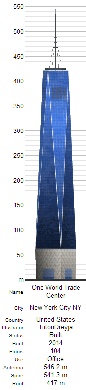 Obrázek zobrazení One World Trade Center s výškou a informacemi převzat z webu Skyscraperpage.com