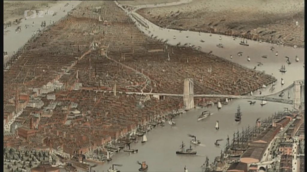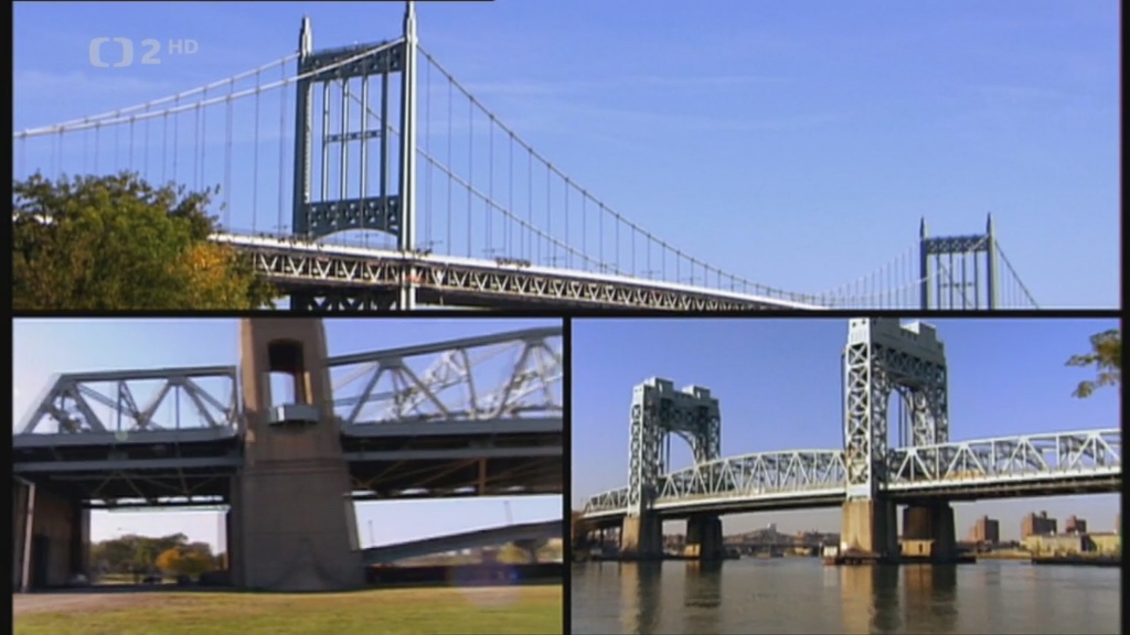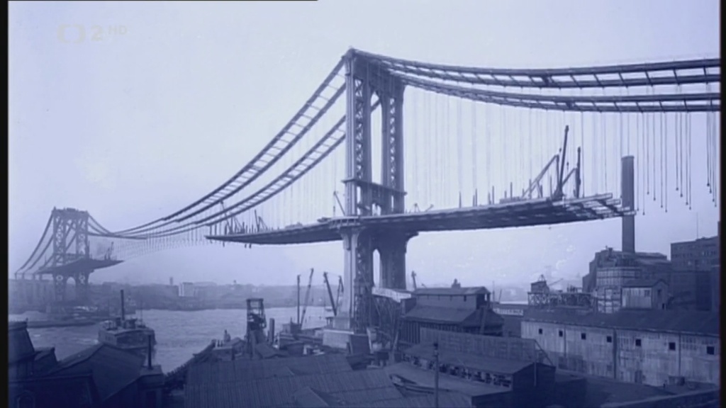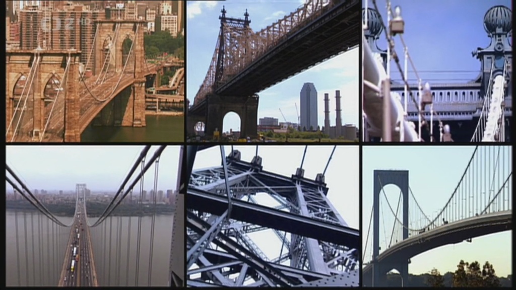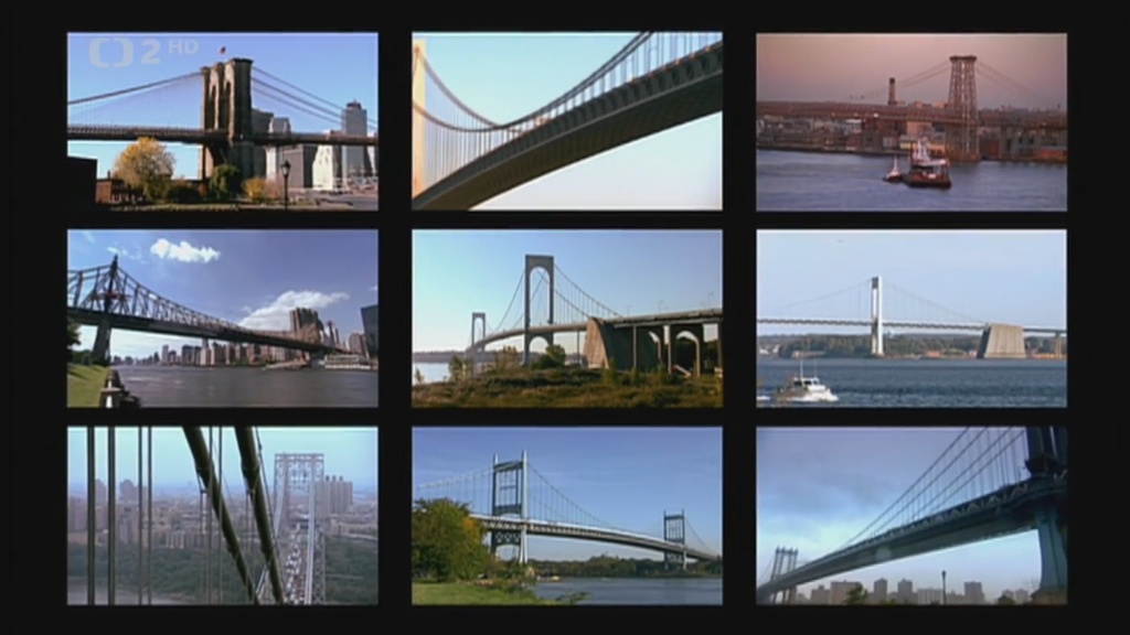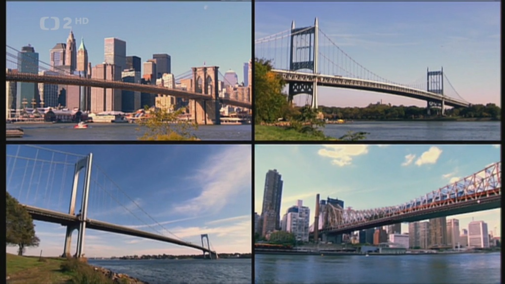 New York, brána do Spojených států. Na ploše necelých osmi set kilometrů čtverečních žije více než osm milionů lidí. Komunikace mají pro velkoměsto opravdu životní význam. V New Yorku je dnes více než dva tisíce mostů, ale film amerických dokumentaristů se z pochopitelných důvodů věnuje jen devíti z nich. Těm, jež jsou nejpozoruhodnější z historických a technologických důvodů. Na prvním místě je pochopitelně onen nejznámější - visutý most spojující Manhattan s Brooklynem z roku 1883.