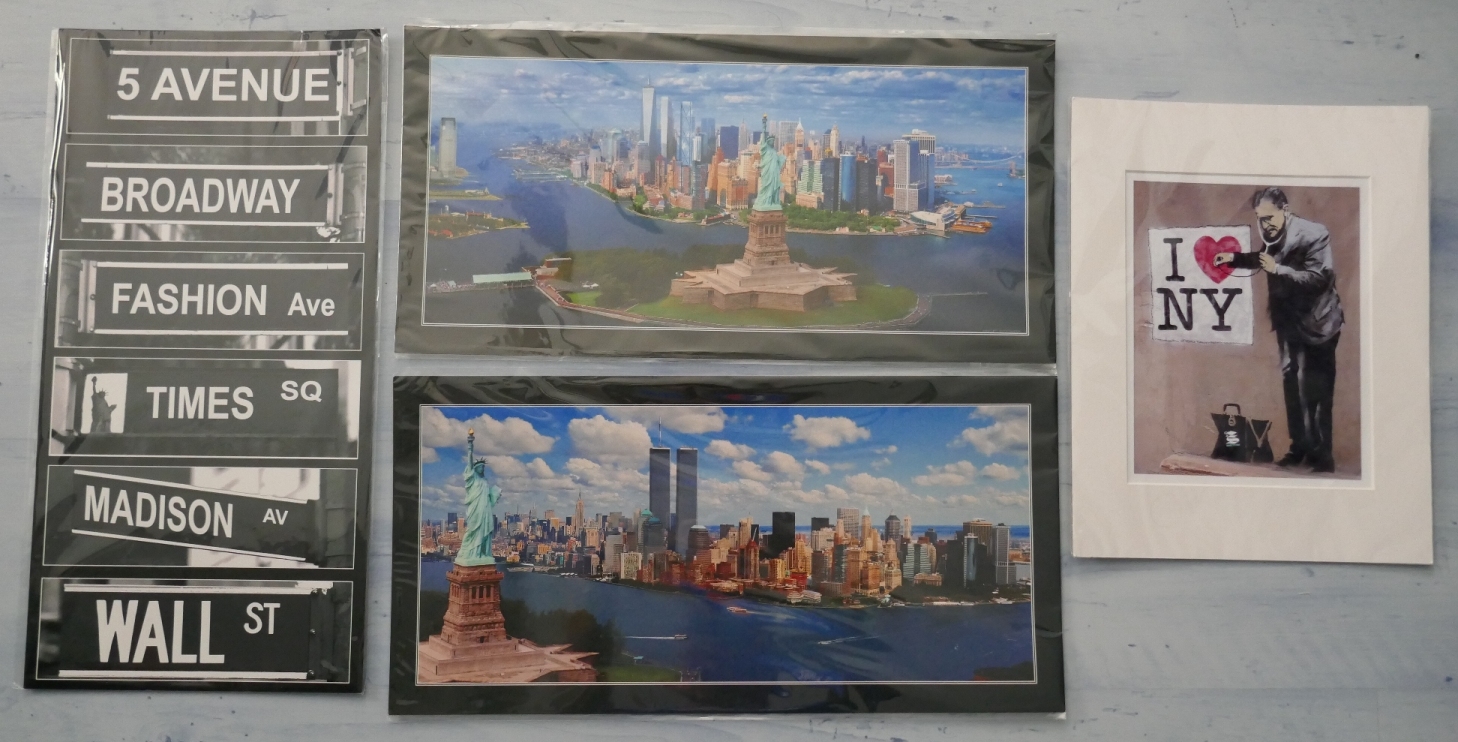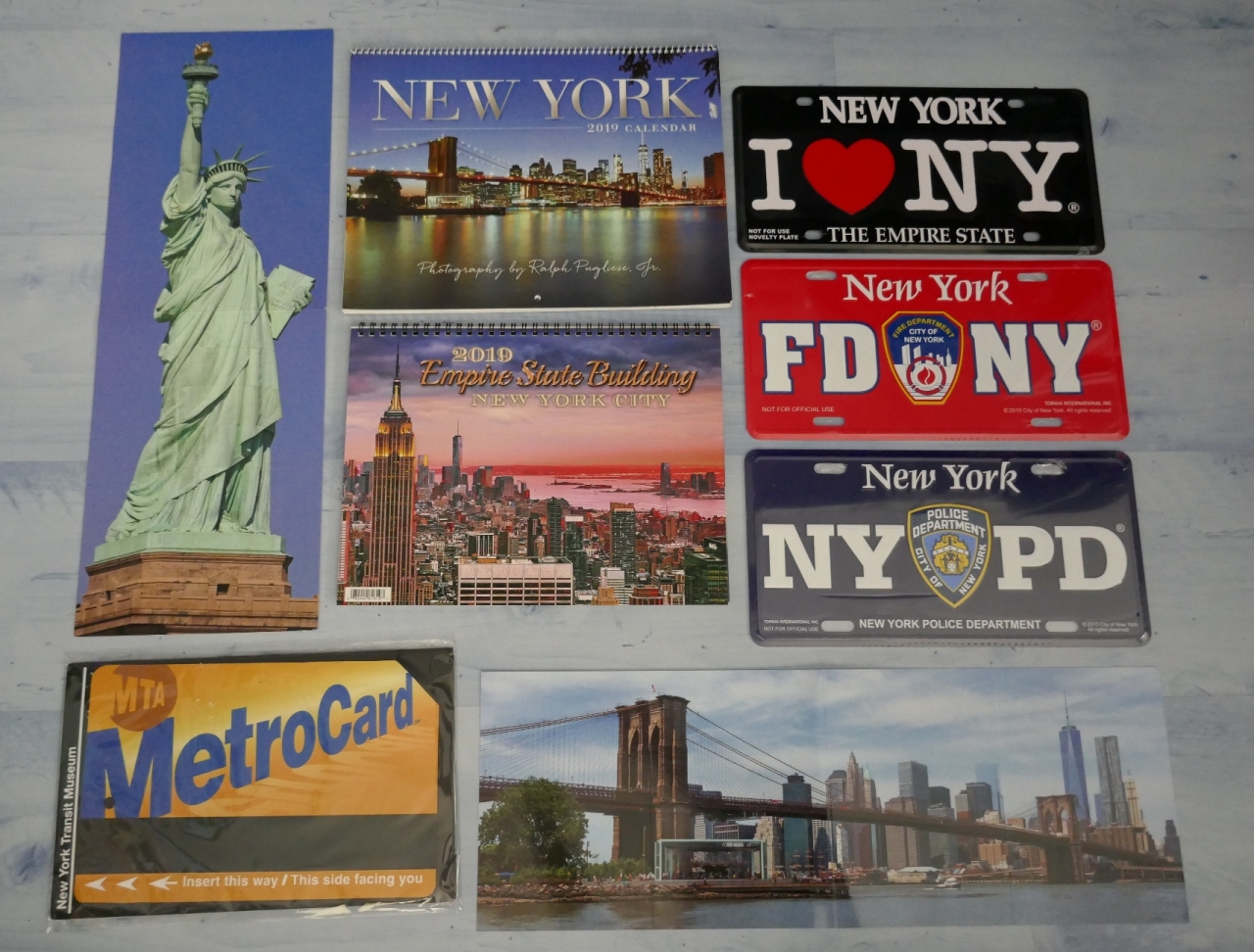 Velké panorama pohlednice, plechové cedule americké SPZ, podložka pod myš MetroCard z obchodu v Grand Central Terminal a již výše viděné kalendáře New York 2019.