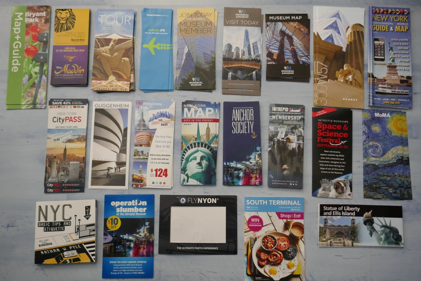 Různé prospekty a letáky. Všude kde jsem viděl nějaké materiály zdarma, tak jsem si vzal a alespoň 2-3 ks od jednoho.