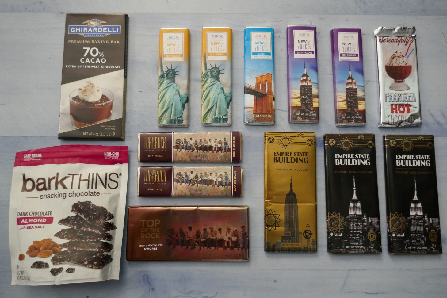 Zde už víte, co je moje droga :D Ano, jsem čokoholik ! První sloupec, tabulková čokoláda a čokoládové snacky barkTHINS v pytlíku jsem si koupil v nějakém obchodu, už ani nevím kde, pak jsem je objevil v obchodě v Grand Central Terminal. Mají více příchutí, nejraději mám hořkou čokoládu, ale někdy dostanu přímo chuť na mléčnou. U dalších čokolád podle obalu vídíte, kde jsem je koupil ... vždy v obchodě se suvenýry a tu horní řadu asi celou z Empire State Building. Frrrozen Hot Chocolate je pro vytvoření onoho známého poháru z restaurace Serendpity 3, který měli Kate Beckinsale a John Cusack ve filmu Lásce na stopě. Foto z restaurace najdete zde a video zde