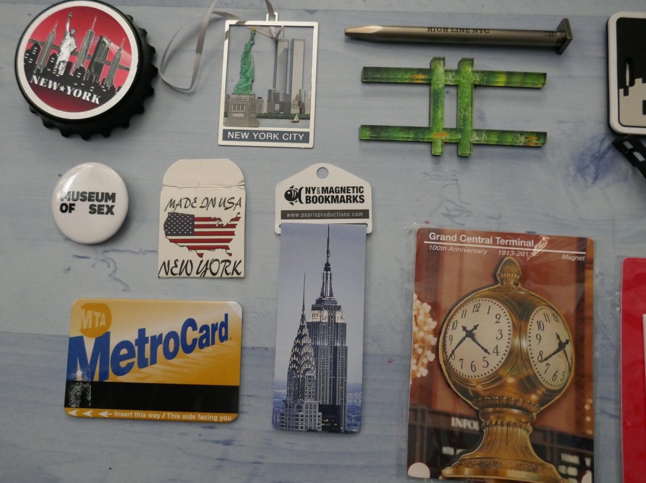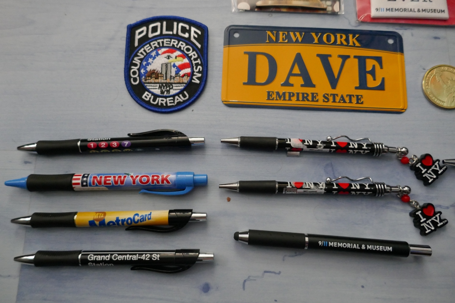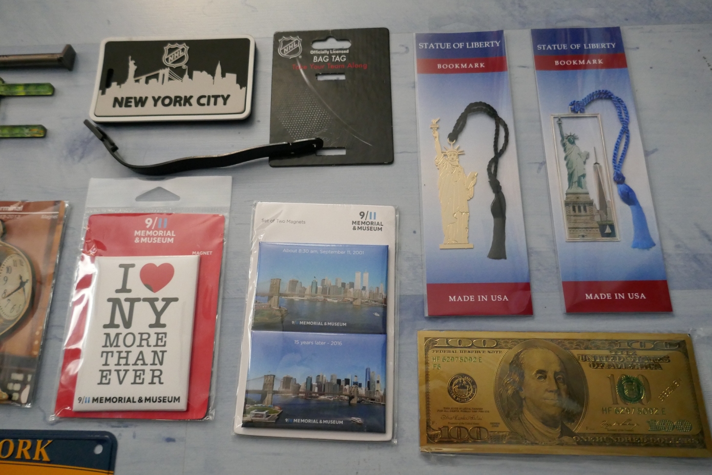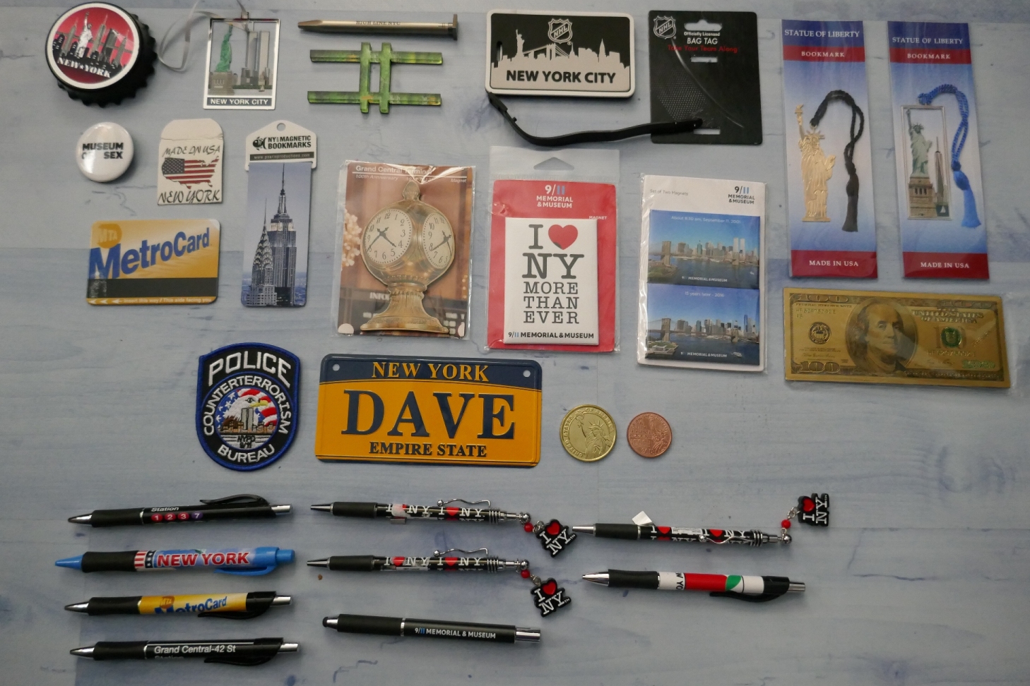 Různé drobnosti. Psací potřeby mám z obchodu se suvenýry v Grand Central Terminal. Magnetický otvírák. New York City jmenovka na kufr z NHL store. Záložky do knih, magnety, pouzdro na MetroCard. Kovová tužka a kolejnice ze stánku se suvenýry přímo na High Line parku. Pamětní mince z automatu v obchodu se suvenýry pod sochou Svobody. Cedulka SPZ se jménem, těch najdete spoustu ve všech obchodech se suvenýry, ale nenašel jsem David, tak mám Dave.