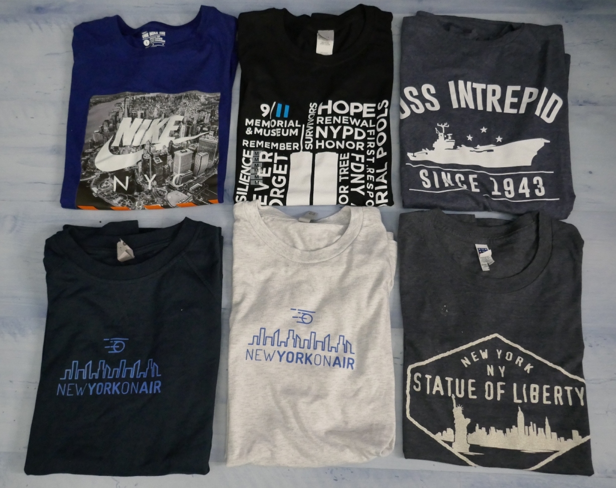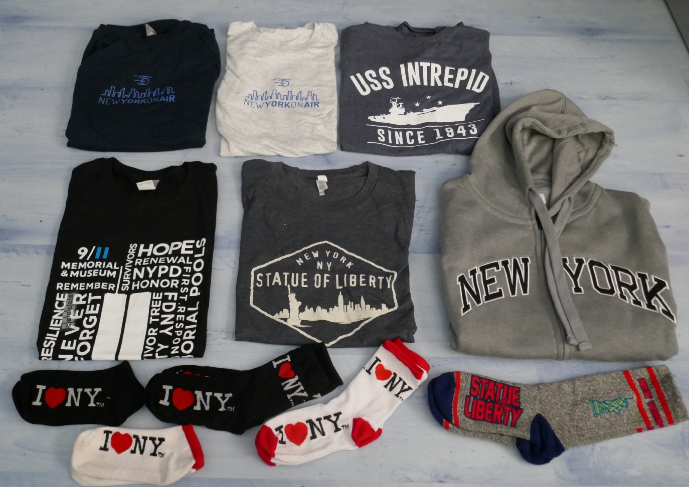 Oblečení mě až tak moc nelákalo, ale když už jsem k němu měl blízko v obchodech se suvenýry, tak jsem se nejen zakoukal. Hlavně obchody u atrakcí, takže trička z letadlové lodě USS Intrepid Sea Air Space Museum, 9/11 Museum, FlyNYON. Mikina s kapucí a zipem s nápisem New York a ponožky I Love NY