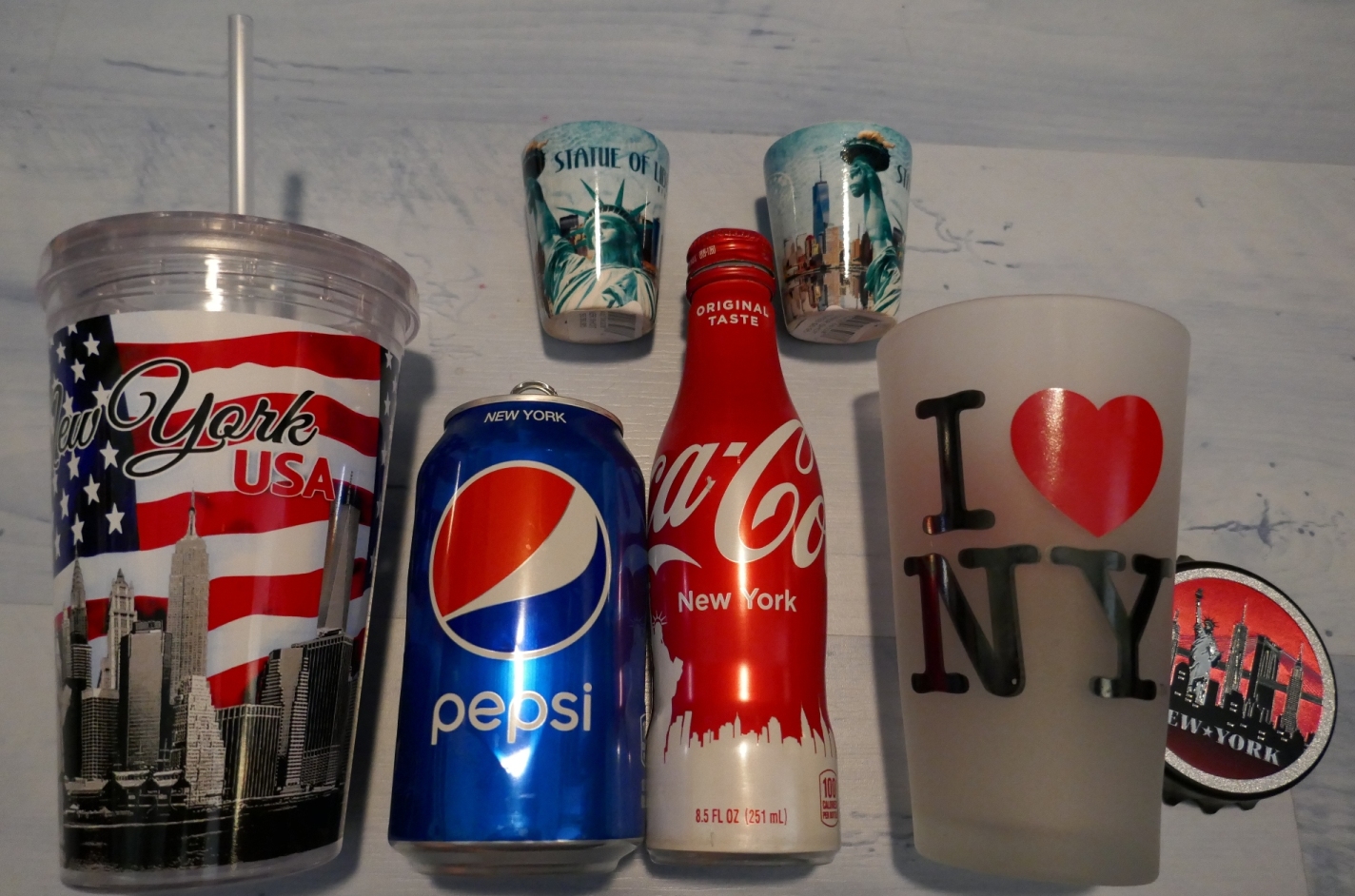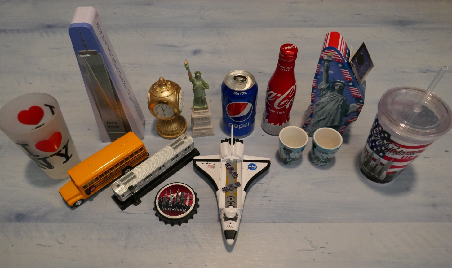 Zde máme trochu jinou kategorii - modely, hračky, a nějaké další drobnosti. Sklenička I Love NY, kelímek na pití do auta nebo prostě To Go :-) Model amerického školního autobusu a vagon metra a zlaté ikonické hodiny mám z obchodu v Grand Central Terminal, ty hodiny mě stály asi 49 USD, ale nekupto :-) Raketoplánu Enterprise NASA mám samozřejmě z obchodu na letadlové lodi, na které se ten pravý raketoplán nachází. Sošku Svobody, plechovou láhev CocaCola a malé porcelánové kalíšky mám z obchodu pod sochou Svobody. Plechovku Pepsi New York koupíte v obchodech s nápoji.