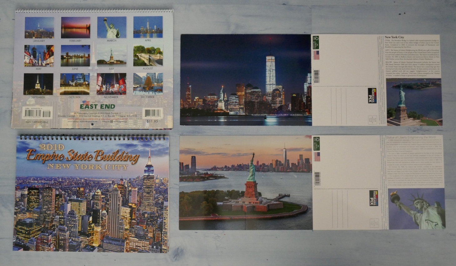 Foto kalendáře pro rok 2019 a velké pohlednice. Kalendáře jsem si koupil přímo v obchodu se suvenýry na Empire State Building.