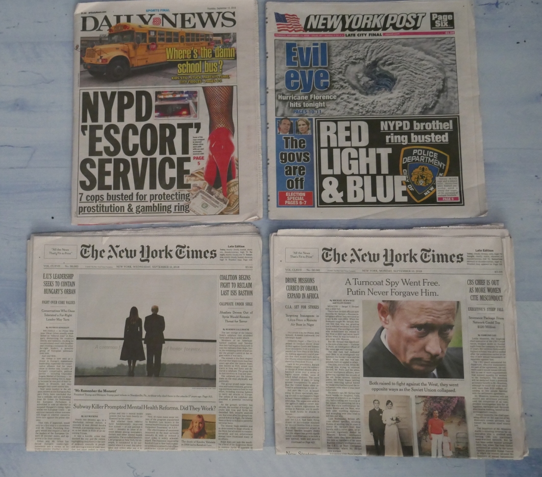 The New York Times, New York Post, Daily News - Americké celosvětově známé noviny zakoupené v pouličním stánku s novinami a jedny The New York Times jsem dostal zdarma přímo ve stejnojmenné budově. Ptal jsem se v informacích jestli mají vydání kolem data 11.září 2001, řekl mi že ne, že je to moc dlouho. Na to se mě zeptal odkud jsem, byl příjemně překvapenej ;-)