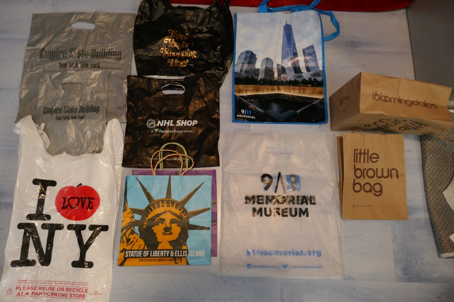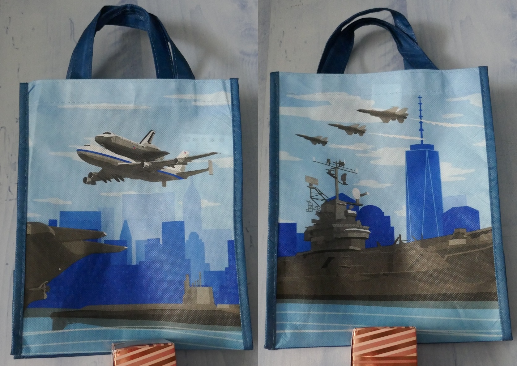 Na konec tu máme obyčejné nákupní i parádní pevnější tašky zakoupené v obchodech jako suvenýr např. s památníkem 11.září s One World Trade Center, tu mám ze stánku u památníků. Potom ta taška vyfocená z obou stran, tu míám z letadlové lodě.