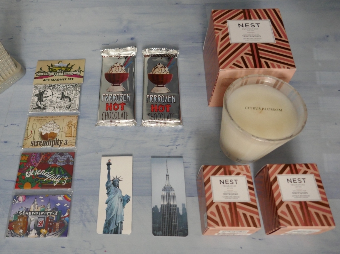 Magnety a čokoláda Hot Frrrozen Chocolate z restaurace Serendipity 3, záložky do knihy a vonná svíčka exkluzivně pro obchodní dům Bloomingdale's. Tu velkou svíčku jsem koupil ještě při druhé návštěvě obchoďáku a vezl jsem domů v batohu a kvůli ní si mě letištní kontrola zavolala k batohu u kontroly zavazadel :D Paní se vůně líbila, ale říkala, že smaller is better :-) Ty malé jsem koupil dříve a do kufru jsem normálně dal, ale když jsem měl pak poslední den kufr už z těžka zavřený a v obalu, tak jsem si netroufnul ho otevírat a ona svíčka by se do něj už stejně nevešla. Vůně je opravdu nádherná citrusová.